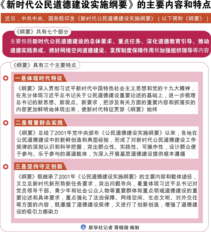 《綱要》具有三個主要特點:一是體現(xiàn)時代特征。《綱要》深入貫徹習(xí)近平新時代中國特色社會主義思想和黨的十九大精神,在充分體現(xiàn)習(xí)近平總書記關(guān)于公民道德建設(shè)重要論述的基礎(chǔ)上,進一步梳理總書記的新思想、新觀點、新要求,把涉及有關(guān)方面的重要內(nèi)容和抓落實的內(nèi)容更加鮮明地體現(xiàn)出來,使新時代特征貫穿《綱要》始終。二是尊重群眾實踐?!毒V要》總結(jié)了2001年黨中央頒布《公民道德建設(shè)實施綱要》以來,各地在公民道德建設(shè)中的新鮮創(chuàng)造和典型經(jīng)驗,形成了對新時代公民道德建設(shè)工作規(guī)律的深刻認(rèn)識和科學(xué)把握,突出群眾性、實踐性、可操作性,設(shè)計群眾便于參與、樂于參與的渠道載體,為深入開展基層道德建設(shè)提供根本遵循。三是堅持守正創(chuàng)新?!毒V要》既繼承了2001年《公民道德建設(shè)實施綱要》的主要內(nèi)容和載體途徑,又立足新時代新形勢新任務(wù)要求,突出問題導(dǎo)向,著重體現(xiàn)習(xí)近平總書記對黨員領(lǐng)導(dǎo)干部、青少年和社會公眾人物等重要群體和重點領(lǐng)域道德建設(shè)的重要論述和具體要求,重點強化了法治保障、網(wǎng)絡(luò)空間、生態(tài)文明、對外交往等方面的內(nèi)容,既遵循了道德建設(shè)規(guī)律,又進行了創(chuàng)新創(chuàng)造,增強了道德建設(shè)的吸引力感染力。