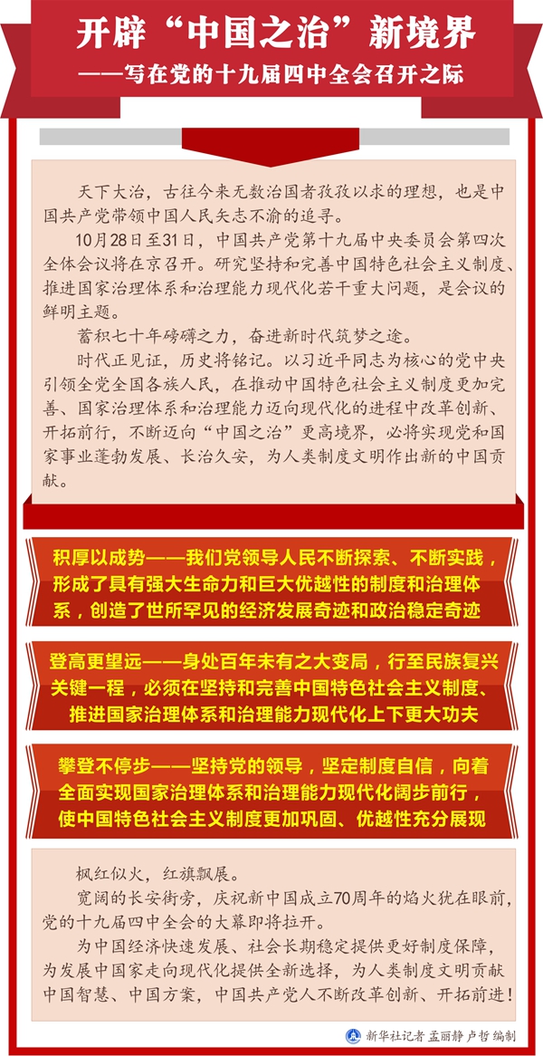 新華社北京10月27日電 題:開辟“中國之治”新境界——寫在黨的十九屆四中全會(huì)召開之際