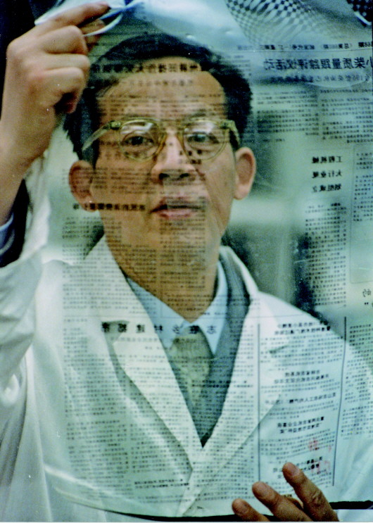 王選正在查看用激光照排系統(tǒng)輸出的報紙膠片(1991年攝)。