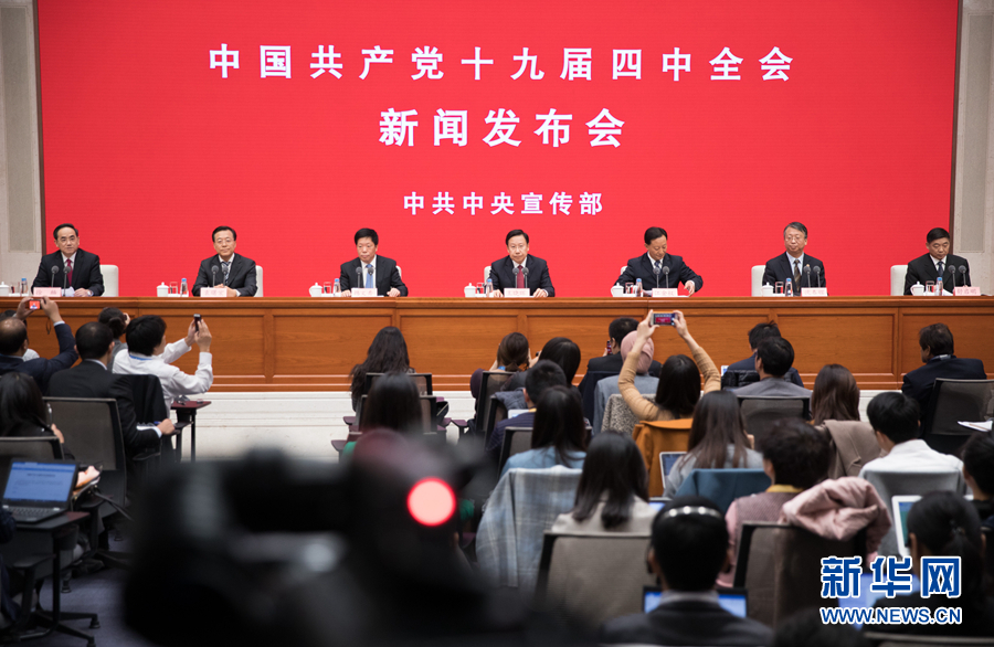 11月1日,中共中央宣傳部在北京舉行中國(guó)共產(chǎn)黨十九屆四中全會(huì)新聞發(fā)布會(huì),請(qǐng)中央宣傳部分管日常工作的副部長(zhǎng)、中央政策研究室副主任王曉暉,中央政策研究室分管日常工作的副主任江金權(quán),中央財(cái)經(jīng)委員會(huì)辦公室分管日常工作的副主任韓文秀,全國(guó)人大常委會(huì)法工委主任、港澳基本法委主任沈春耀,司法部黨組書記、副部長(zhǎng)袁曙宏,全國(guó)政協(xié)副秘書長(zhǎng)舒啟明介紹有關(guān)情況,并答記者問(wèn)。中央宣傳部副部長(zhǎng)、國(guó)務(wù)院新聞辦公室主任徐麟主持新聞發(fā)布會(huì)。 新華社記者金立旺攝
