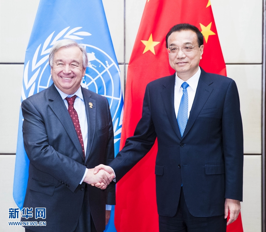 李克強表示,當前國際形勢錯綜復雜變化,中國作為聯(lián)合國安理會常任理事國,將繼續(xù)堅定維護多邊主義,維護以聯(lián)合國為核心的國際體系,維護以國際法為基礎的國際秩序。中方愿深化同聯(lián)合國的合作,支持秘書長先生的工作,同各方一道落實好2030年可持續(xù)發(fā)展議程。在應對氣候變化問題上,中國將承擔作為發(fā)展中國家應盡的國際責任和義務,遵循共同但有區(qū)別的責任原則,同國際社會一道全面有效落實《巴黎協(xié)定》,促進綠色、低碳和可持續(xù)發(fā)展。