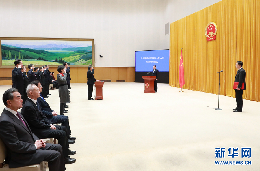 宣誓后,李克強(qiáng)說,忠于憲法、遵守法律是每一名公職人員必須遵循的基本行為準(zhǔn)則,讓人民過上好日子是每一名公職人員必須謹(jǐn)記的奮斗目標(biāo)。他要求大家堅持以習(xí)近平新時代中國特色社會主義思想為指導(dǎo),依法履職,為民履職,實干履職,廉潔履職。帶頭尊法學(xué)法守法用法,積極推進(jìn)改革創(chuàng)新,在攻堅克難中彰顯擔(dān)當(dāng),在狠抓落實中展現(xiàn)作為,嚴(yán)守紀(jì)律規(guī)矩,嚴(yán)格秉公用權(quán),勤儉辦事,厲行節(jié)約,傾情竭力把人民群眾最關(guān)切最期盼的事情辦實辦好,齊心協(xié)力推動經(jīng)濟(jì)社會持續(xù)健康發(fā)展。