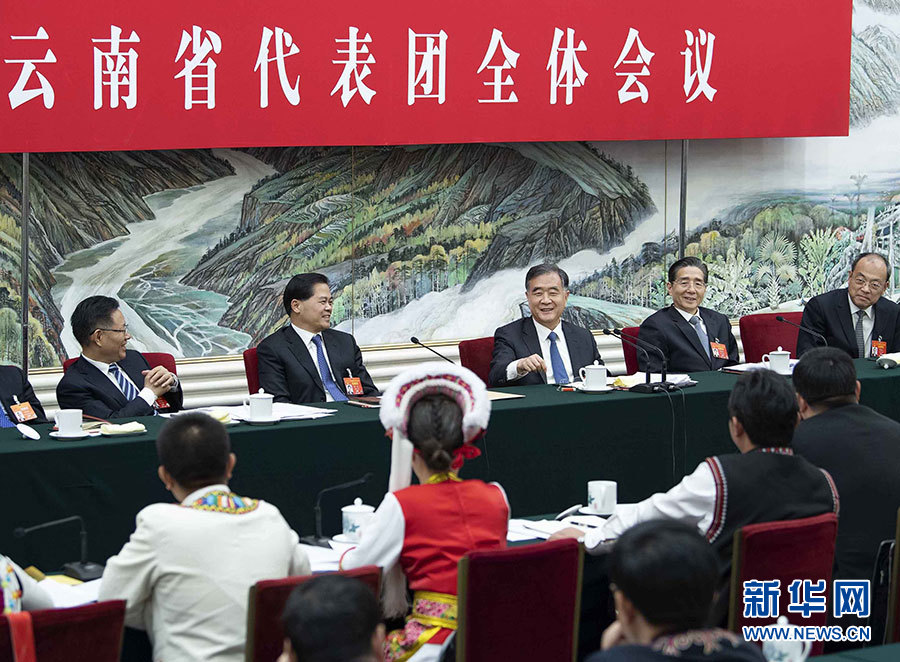 汪洋分別參加臺灣代表團(tuán)、云南代表團(tuán)審議。在臺灣代表團(tuán),汪洋在認(rèn)真聽取符之冠、陳云英、陳軍等代表發(fā)言后指出,習(xí)近平總書記在《告臺灣同胞書》發(fā)表40周年紀(jì)念會上的重要講話,是指引新時(shí)代對臺工作的綱領(lǐng)性文獻(xiàn)。要學(xué)深悟透講話的精神實(shí)質(zhì)和核心要義,深刻認(rèn)識兩岸統(tǒng)一是歷史大勢,牢牢把握對臺工作正確方向。要廣泛深入聽取臺灣同胞的意見,完善配套政策,把促進(jìn)兩岸經(jīng)濟(jì)文化交流合作“31條措施”等惠臺舉措落到實(shí)處,深化兩岸融合發(fā)展。要堅(jiān)持一個(gè)中國原則和“九二共識”,堅(jiān)決反對“臺獨(dú)”,團(tuán)結(jié)更多臺灣同胞共擔(dān)民族大義,為推動兩岸關(guān)系和平發(fā)展、推進(jìn)祖國和平統(tǒng)一進(jìn)程作出更大貢獻(xiàn)。在云南代表團(tuán),汪洋認(rèn)真聽取阮成發(fā)、馬正山、玉龍等代表的發(fā)言,充分肯定過去一年云南改革發(fā)展取得的成績。他希望云南深入貫徹習(xí)近平總書記對云南工作的重要指示精神,堅(jiān)定不移落實(shí)黨的民族政策和宗教工作基本方針,大力幫助人口較少民族和“直過民族”發(fā)展,努力打造民族團(tuán)結(jié)進(jìn)步示范區(qū)。要堅(jiān)決打好脫貧攻堅(jiān)戰(zhàn),努力攻克深度貧困堡壘,著力提高脫貧質(zhì)量,確保全面小康路上一個(gè)都不掉隊(duì)。