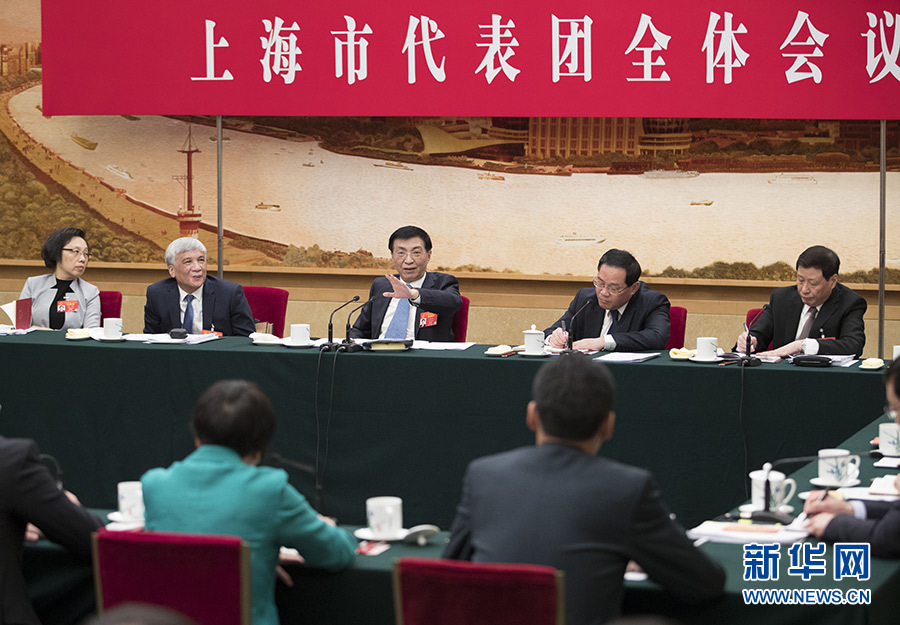 3月7日,中共中央政治局常委、中央書記處書記王滬寧參加十三屆全國人大二次會議上海代表團的審議。 新華社記者 王曄 攝