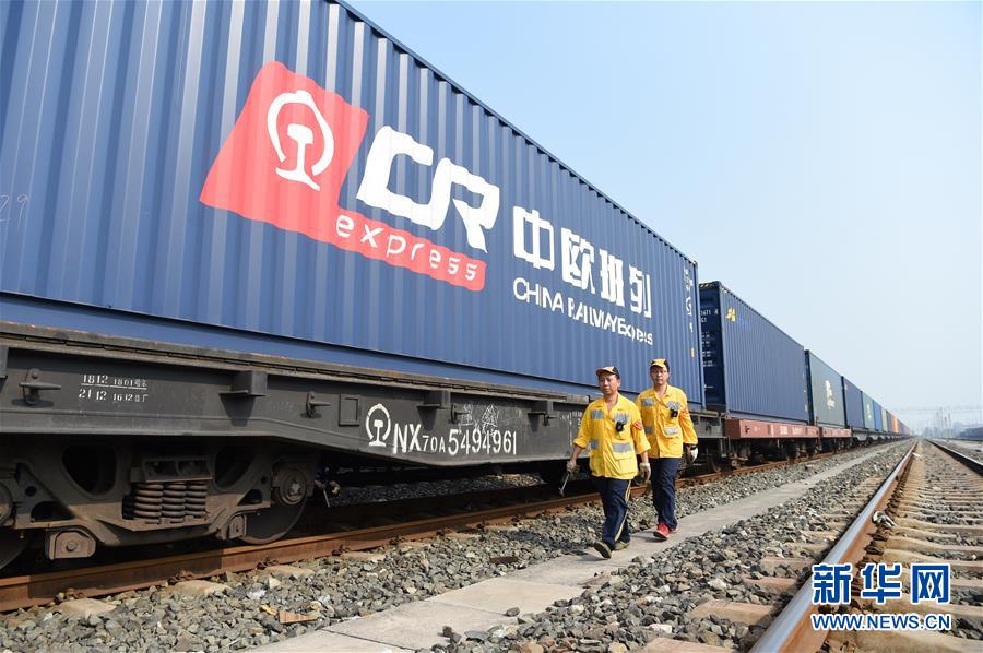 在位于重慶沙坪壩區(qū)的興隆場上行出發(fā)作業(yè)場,進(jìn)行列檢作業(yè)的兩名貨車檢車員從中歐班列旁走過(2018年8月29日攝)。新華社記者 唐奕 攝