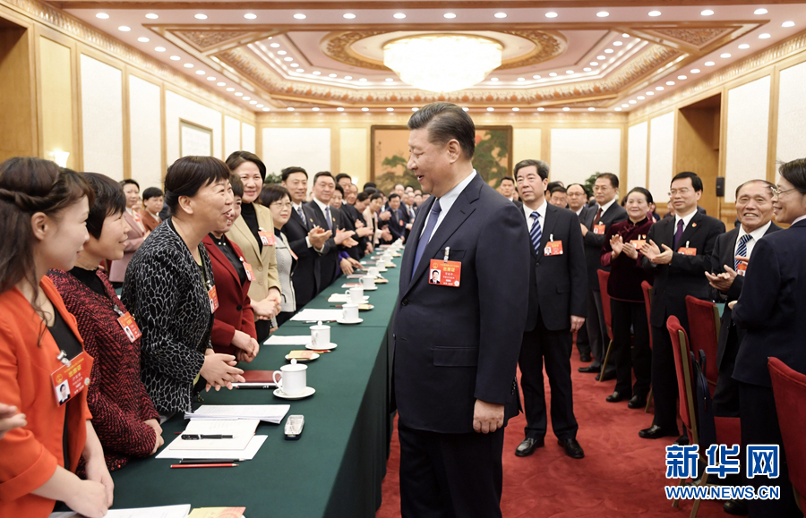 3月8日,中共中央總書記、國家主席、中央軍委主席習近平參加十三屆全國人大二次會議河南代表團的審議。在“三八”國際勞動婦女節(jié)到來之際,習近平代表黨中央,向參加全國兩會的女代表、女委員、女工作人員,向全國各族各界婦女,致以節(jié)日的祝賀和美好的祝福。這是習近平同女代表親切握手。新華社記者 謝環(huán)馳 攝
