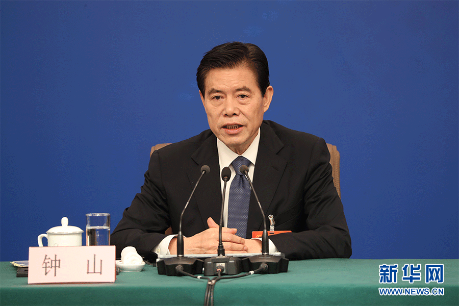 十三屆全國人大二次會議新聞中心3月9日(星期六)10時30分在梅地亞中心新聞發(fā)布廳舉行記者會,邀請商務(wù)部部長鐘山、副部長兼國際貿(mào)易談判副代表王受文、副部長錢克明就“促進(jìn)形成強(qiáng)大國內(nèi)市場 推動全方位對外開放”相關(guān)問題回答中外記者提問。圖為商務(wù)部部長鐘山。新華網(wǎng)/中國政府網(wǎng) 陳杰 攝