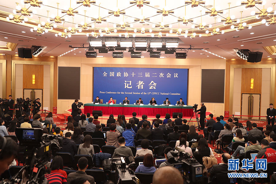 全國政協(xié)十三屆二次會(huì)議3月10日(星期日)上午8:45在梅地亞兩會(huì)新聞中心舉行記者會(huì),邀請(qǐng)5位政協(xié)委員就“新時(shí)代政協(xié)履職”回答記者提問。圖為記者會(huì)現(xiàn)場。新華網(wǎng)、中國政府網(wǎng)進(jìn)行現(xiàn)場直播。新華網(wǎng)/中國政府網(wǎng) 劉廈攝