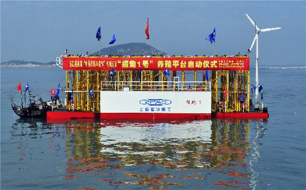 ??? 2018年10月26日上午,全國首創(chuàng)的深遠(yuǎn)海機(jī)械化養(yǎng)殖平臺(tái)“振鮑1號(hào)”在連江縣苔菉鎮(zhèn)東洛島海域下水啟用。新華網(wǎng)發(fā)(鄭帥 攝)