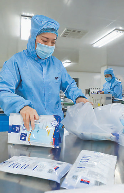 近日,各地口罩生產(chǎn)企業(yè)抓緊生產(chǎn),全力增加市場供應(yīng)。圖為浙江省德清縣一家口罩企業(yè)生產(chǎn)車間,工作人員在包裝口罩。王正 王玨攝影報道(影像中國)