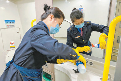 為應(yīng)對疫情,鐵路部門全力做好相關(guān)防控工作。圖為南昌開往南京的G1496次列車上,南昌客運段工作人員認真做好車廂清潔、消毒工作。鮑贛生攝(人民視覺)