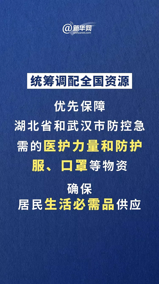會議強(qiáng)調(diào),要突出重點(diǎn),進(jìn)一步加強(qiáng)湖北省和武漢市疫情防控。中央向湖北派出指導(dǎo)組,推動加強(qiáng)防控一線工作。統(tǒng)籌調(diào)配全國資源,優(yōu)先保障湖北省和武漢市防控急需的醫(yī)護(hù)力量和防護(hù)服、口罩等物資,確保居民生活必需品供應(yīng),物資調(diào)運(yùn)實(shí)行綠色通道。湖北省和武漢市要層層落實(shí)責(zé)任,加快建設(shè)集中收治醫(yī)院、改造酒店作為隔離區(qū),做好發(fā)熱病人及時(shí)診治,防范發(fā)生次生問題。加強(qiáng)醫(yī)護(hù)人員輪換和防護(hù),緩解他們的身體和心理壓力。嚴(yán)格做好城鄉(xiāng)結(jié)合部、省市邊界人流進(jìn)出管理,做到外防輸出、內(nèi)防擴(kuò)散。