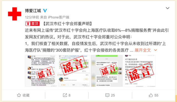 近來有網(wǎng)上謠傳“武漢市紅十字會(huì)向上海醫(yī)療隊(duì)收取6%—8%捐贈(zèng)服務(wù)費(fèi)”并由此引發(fā)網(wǎng)友們的熱議。對(duì)于此,武漢市紅十字會(huì)鄭重對(duì)公眾申明:
