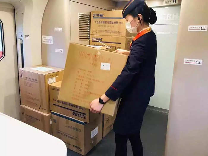 當(dāng)天下午,列車從鄭州東站返回廣州南站時,又接到一批特殊的禮物。中國鐵路鄭州局有限公司防控所支援武漢的醫(yī)療物資,搭乘高鐵車遞到武漢站。幾名旅客看到乘務(wù)員姑娘們忙碌地搬運這些大箱子,都自告奮勇奮前來幫忙,大家齊心協(xié)力,不一會兒就把全部物資搬運上車。列車載著這些愛心物資,迅速送達(dá)武漢。