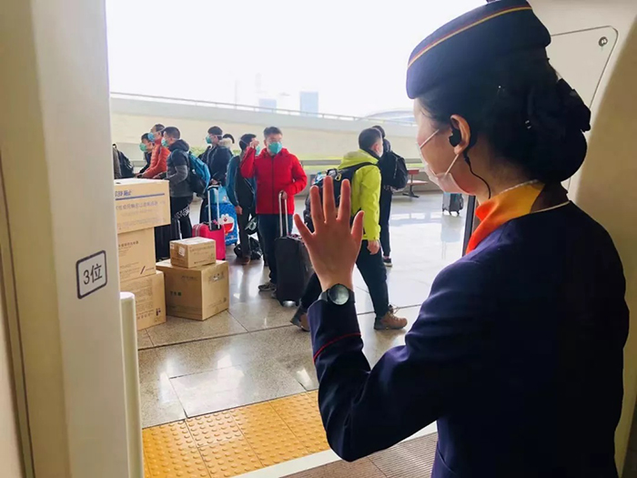 關(guān)車門前,列車長跟醫(yī)生們揮手告別,并帶領(lǐng)乘務(wù)員們大聲向他們喊了一句“加油!”醫(yī)生們也說:“等我們回去,你們再來接我們!”