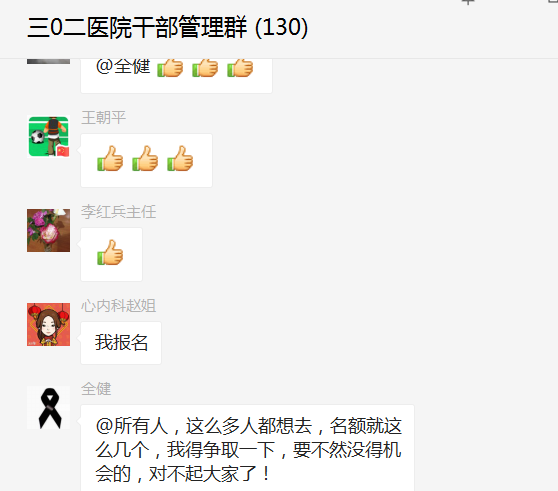 在航空工業(yè)通用醫(yī)療三〇二醫(yī)院的微信群里,有一位檢驗科醫(yī)生@院長申請赴一線。陳述完專業(yè)理由后他提了個特殊理由:“我們醫(yī)院這么多人出去,吃不慣也不好,我做菜還是很好吃的,給他們做后勤保障絕對也沒問題。帶上我只有好處沒有壞處,我也不會給組織拖后腿,希望院長給我爭取一下,謝謝!”他說這么多人都想去,名額就這么幾個,他不爭取一下就沒得機會的,對不起大家了!