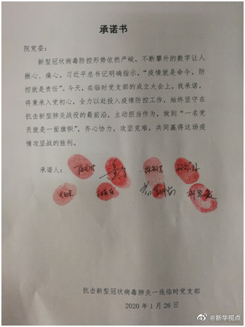 “我承諾,將秉承入黨初心,全力以赴投入疫情防控工作……”應(yīng)對疫情,湖北省中醫(yī)院新型冠狀病毒肺炎抗擊一線臨時黨支部成立。黨支部成員由感染科、肺病科、ICU、檢驗科等醫(yī)、技、藥、護、行政、后勤等科室的66名黨員構(gòu)成。多名臨時黨支部成員還簽下承諾書,表示將主動擔當作為,做到“一名黨員就是一面旗幟”。(記者 梁建強)