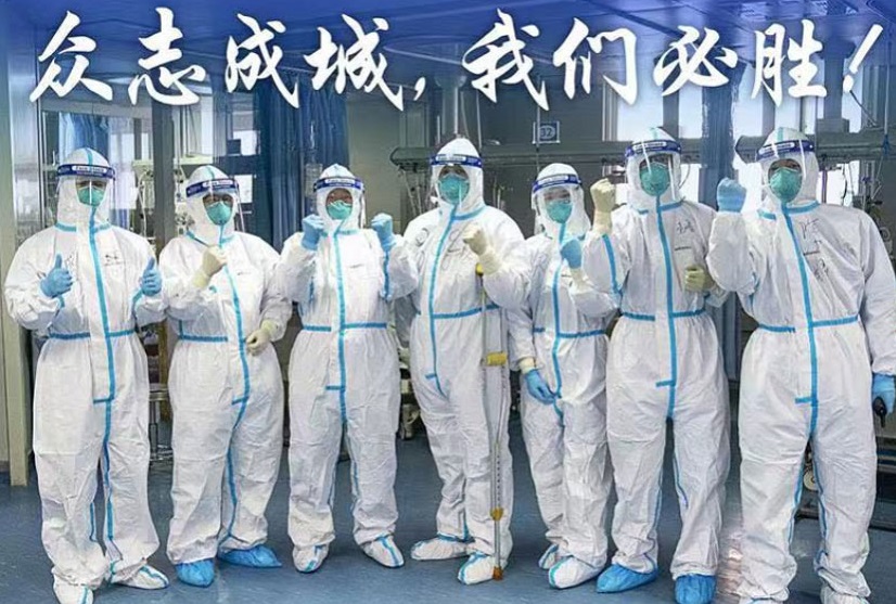 1月24日,武漢大學(xué)中南醫(yī)院重癥隔離病房?jī)?nèi)的醫(yī)護(hù)人員一起鼓勁加油。