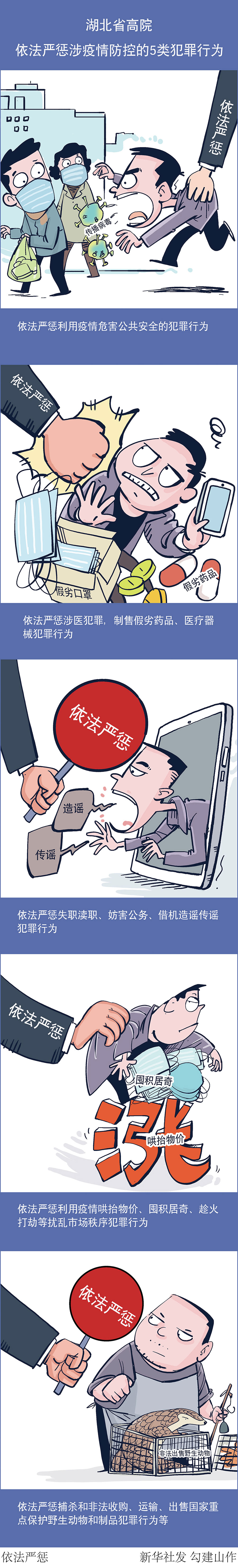 新華社武漢2月5日電(記者梁建強(qiáng))記者5日從湖北省高級(jí)人民法院獲悉,湖北省高院已制訂下發(fā)《關(guān)于充分發(fā)揮審判職能為新型冠狀病毒感染的肺炎疫情防控提供司法保障和服務(wù)的意見》,要求各級(jí)法院認(rèn)真落實(shí)黨中央、國務(wù)院、最高人民法院和湖北省委、省政府關(guān)于疫情防控相關(guān)決策部署,充分發(fā)揮審判職能作用,切實(shí)維護(hù)社會(huì)穩(wěn)定,保護(hù)廣大人民群眾的生命健康安全和合法權(quán)益。其中,明確了5類將依法嚴(yán)懲的刑事犯罪類型。