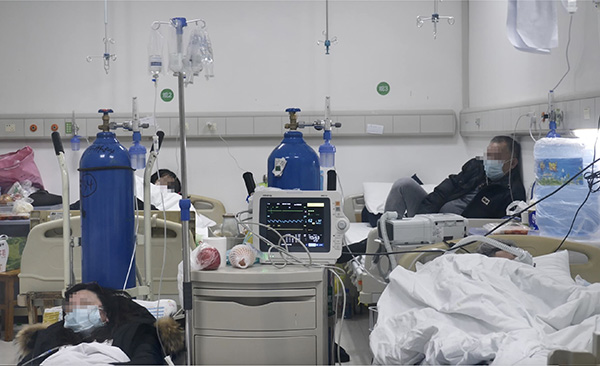 留觀室里的患者,幾乎每個人身邊立著一個近一人高的氧氣鋼瓶,更有病情嚴重者用上了呼吸機。他們大多數人坐在病床上,時而躺下,沒有交談。有的患者見到醫(yī)生時會哭泣;有的患者吸著氧,靜靜地發(fā)呆,眼睛沒有神。