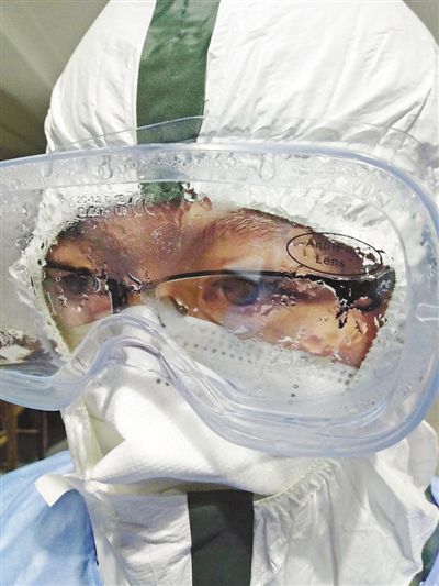 9日,國家緊急醫(yī)學(xué)救援隊(海南)隊員、海南醫(yī)學(xué)院第一附屬醫(yī)院醫(yī)生程少文承擔(dān)武漢國際會展中心方艙醫(yī)院的值班任務(wù),不到兩小時護目鏡上的霧氣就形成了大片積水。國家緊急醫(yī)學(xué)救援隊(海南)供圖
