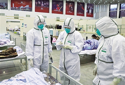 2月8日,醫(yī)務人員在武漢客廳方艙醫(yī)院查房。新華社發(fā)