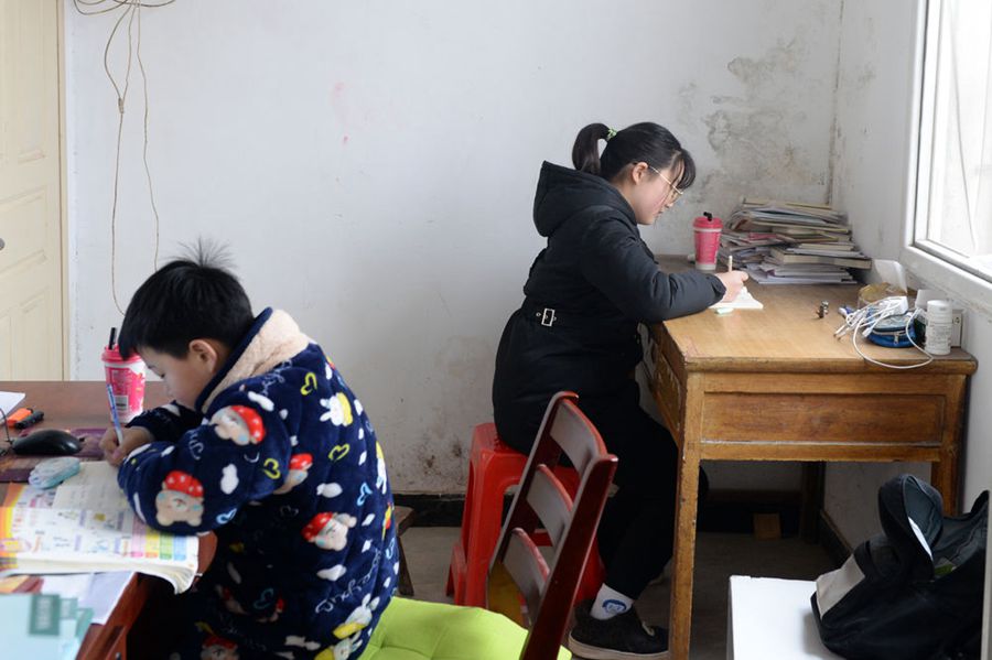 崔愛國和周超群的兩個(gè)孩子在衛(wèi)生室已消毒的隔間內(nèi)學(xué)習(xí)。(新華社記者黃博涵 攝)