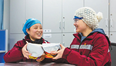 2月9日,中南大學(xué)湘雅二醫(yī)院援鄂醫(yī)療隊(duì)護(hù)士周杰楠(右)在武漢度過了29歲生日。在緊張的工作間隙,她與同樣是當(dāng)天過生日的同事曾艷一起吃方便面當(dāng)做慶祝。本報(bào)記者 張武軍攝
