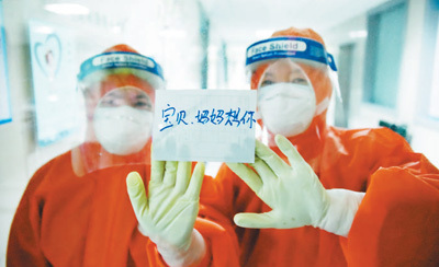 在湖北省十堰市鄖陽區(qū)人民醫(yī)院感染科,28歲的護(hù)士焦嬌堅(jiān)守在隔離病區(qū),偶爾才能與3歲的女兒視頻通話。圖為焦嬌(左)與同事將寫有“寶貝,媽媽想你”的紙條貼在玻璃上。周家山攝(人民視覺)