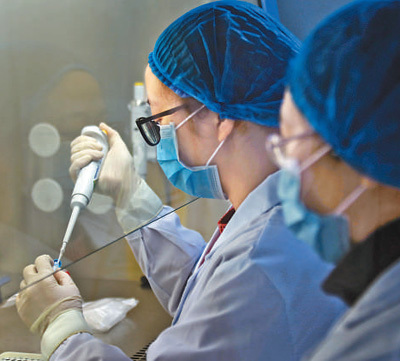 重慶市長壽區(qū)疾病預(yù)防控制中心“90后”女檢測(cè)員文纖纖(左)、楊涵與病毒“零距離”對(duì)峙,持續(xù)戰(zhàn)斗在新型冠狀病毒PCR檢測(cè)室,為患者的診治爭取了寶貴時(shí)間。圖為兩位檢測(cè)員在提取化驗(yàn)結(jié)果。樊 強(qiáng)攝(人民視覺)