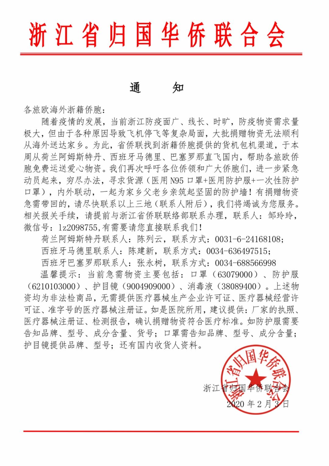 大疫當(dāng)前爭分奪秒。2月3日,一則浙江省歸國華僑聯(lián)合會聯(lián)系貨運包機(jī)直飛國內(nèi)尋求抗疫捐贈物資的通知,將眾多歐洲華僑華人凝聚在一起。