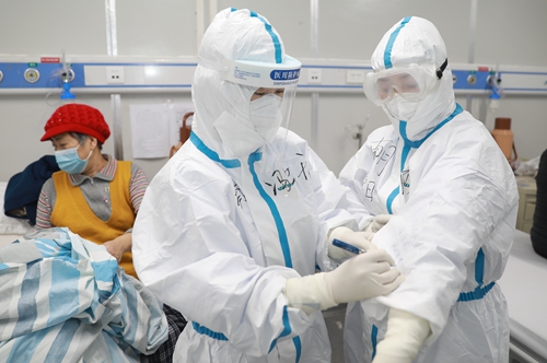 雷神山醫(yī)院內(nèi)患者告訴護(hù)士飲食禁忌,由于沒(méi)有紙護(hù)士就記錄在衣服上