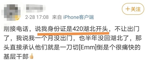 盲目排擠湖北籍人士,并非局限于一城一地。前不久,記者表妹在深圳機(jī)場和其他湖北籍乘客一起被限制登機(jī),即使相關(guān)證件能證明她近三個(gè)月一直待在香港,航空公司仍不放行;有個(gè)朋友自駕返程上班,中部某省高速公路工作人員查身份證時(shí)發(fā)現(xiàn)車上有湖北籍人員,立刻將他們勸返……