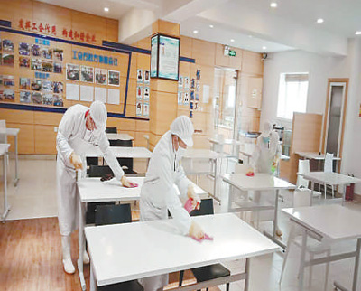 樂星汽車電子(青島)有限公司人員在對(duì)餐廳進(jìn)行嚴(yán)格消毒。王 洪攝
