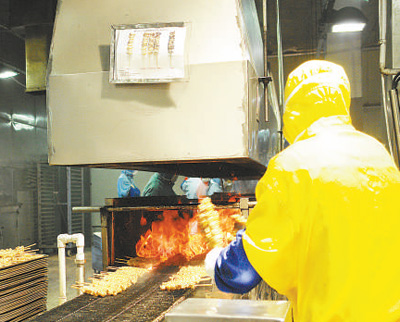 測(cè)體溫、登記、換服裝、消毒,走進(jìn)沈陽華美食品有限公司的熟食加工車間,只見已經(jīng)啟動(dòng)的3條生產(chǎn)線正有條不紊運(yùn)行,300多名工人忙著給雞肉穿串、炭烤、蒸煮、速凍、包裝……一袋袋熟食“新鮮出爐”,被送入冷庫。