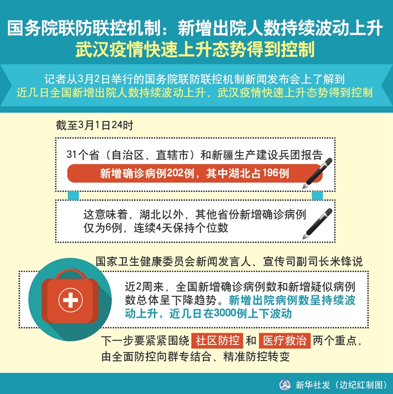 ? 新華社北京3月2日電(記者屈婷、周瑋)記者從2日舉行的國(guó)務(wù)院聯(lián)防聯(lián)控機(jī)制新聞發(fā)布會(huì)上了解到,近幾日全國(guó)新增出院人數(shù)持續(xù)波動(dòng)上升,武漢疫情快速上升態(tài)勢(shì)得到控制。