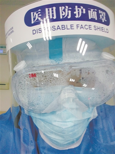 工作間隙,四川省第七批援鄂醫(yī)療隊(duì)隊(duì)員、核工業(yè)四一六醫(yī)院呼吸科護(hù)士向莉莉自拍下因汗水模糊的護(hù)目鏡。向莉莉供圖