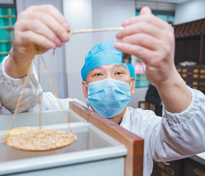 3月2日,福建省泉州市德化縣醫(yī)院的中藥師在根據(jù)處方調(diào)配中藥。邵玉姿 許華森攝影報道