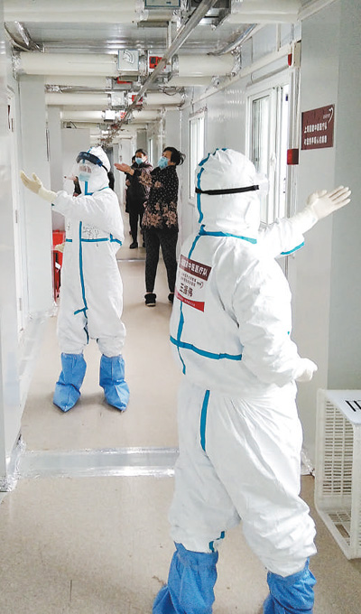 武漢雷神山醫(yī)院,上海支援湖北醫(yī)療隊的醫(yī)護(hù)人員在教患者按照“六字訣”中醫(yī)功法進(jìn)行鍛煉。姜泓冰 龔亞斌攝影報道
