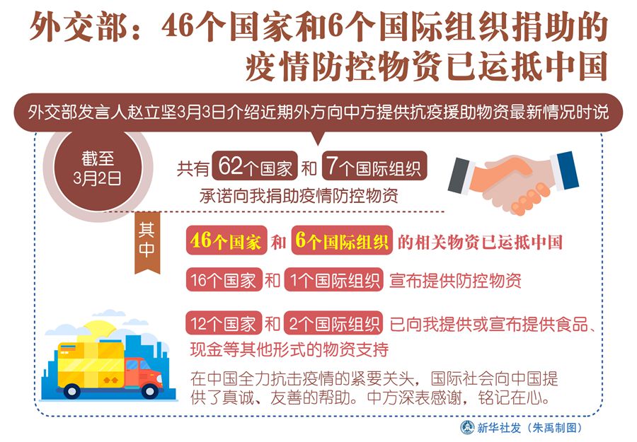 新華社北京3月3日電(記者朱超)外交部發(fā)言人趙立堅3日介紹近期外方向中方提供抗疫援助物資最新情況時說,截至3月2日,共有46個國家和6個國際組織的相關物資已運抵中國,中方深表感謝,銘記在心。