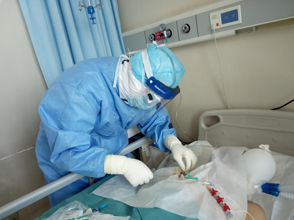 調(diào)整狀態(tài)、做好防護(hù)、熟悉工作,張雙圓穩(wěn)扎穩(wěn)打,很快就恢復(fù)了斗志。重癥病房里那個(gè)年輕戰(zhàn)士的身影隨處可見。穿著厚重的防護(hù)設(shè)備為患者穿刺、抽血、輸液、靜推、俯臥位,他不怕累。為氣管插管患者霧化吸痰時(shí)被呼吸機(jī)管道內(nèi)的異物噴濺到,他不畏懼??吹交颊弑徊《菊勰サ较敕艞?,他不接受。