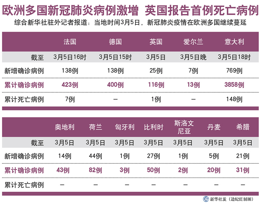 新華社北京3月6日電 綜合新華社駐外記者報(bào)道:5日,新冠肺炎疫情在歐洲多國繼續(xù)蔓延。除意大利外,法國和德國確診病例都有較大幅度增加,英國報(bào)告首例死亡病例。