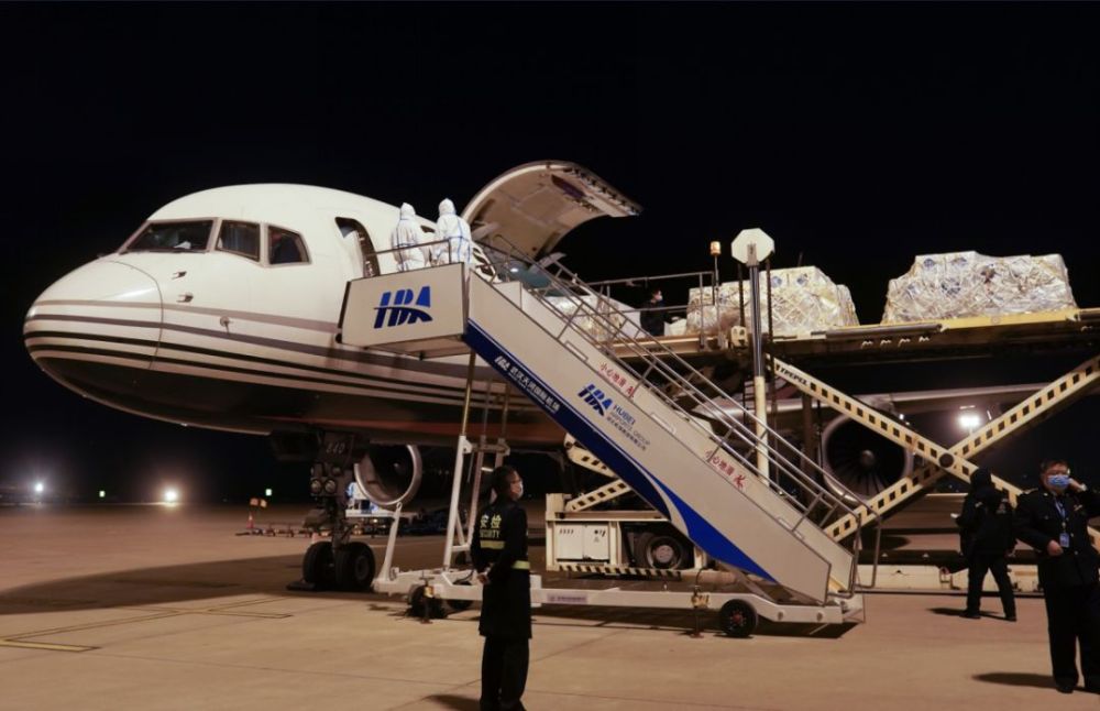 工作人員在武漢天河機場搬運醫(yī)療物資(新華社記者 程敏 攝)