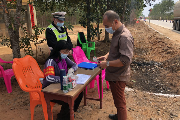 全國(guó)人大代表、湛江市遂溪縣吾良村婦女主任劉小權(quán)(左一)在村口設(shè)立黨員值班崗哨,對(duì)來往車輛及人員進(jìn)行摸排登記和體溫監(jiān)測(cè),勸退勸返村民走親訪友、聚眾聚餐。