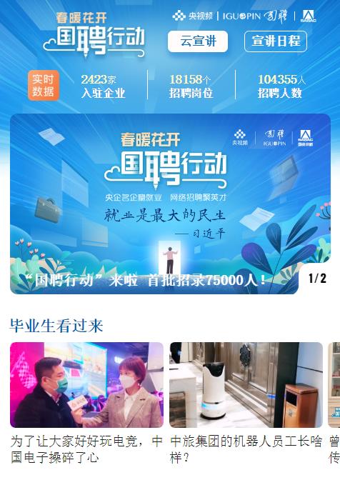 由中央廣播電視總臺(tái)“央視頻”攜手國(guó)投集團(tuán),與國(guó)務(wù)院國(guó)資委共同推出的大型線上招聘活動(dòng)——“春暖花開(kāi) 國(guó)聘行動(dòng)”自3月2日啟動(dòng)以來(lái),企業(yè)踴躍參與,求職者紛紛投遞簡(jiǎn)歷、尋找機(jī)遇。截至目前,中央企業(yè)和知名民企先后舉辦了18場(chǎng)網(wǎng)絡(luò)招聘“云宣講”,面向社會(huì)提供了超10萬(wàn)個(gè)招聘職位,累計(jì)入駐企業(yè)近2500家。