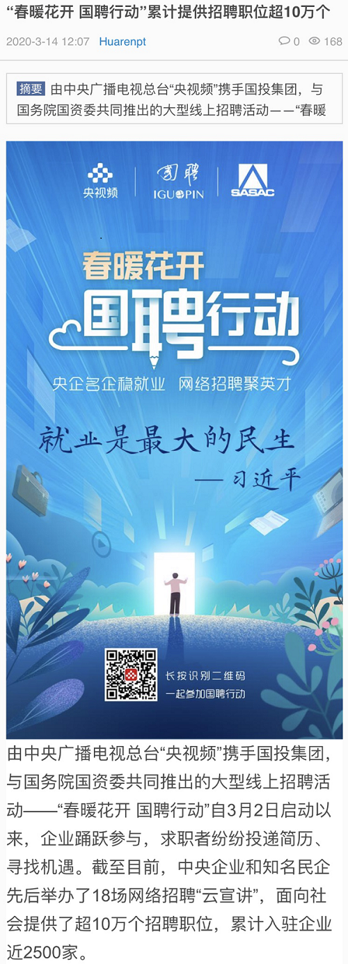 由中央廣播電視總臺“央視頻”攜手國投集團,與國務(wù)院國資委共同推出的大型線上招聘活動——“春暖花開 國聘行動”,自3月2日啟動以來,企業(yè)踴躍參與,求職者紛紛投遞簡歷。截至3月14日已面向社會提供了超10萬個招聘職位,累計入駐企業(yè)近2500家,引發(fā)眾多媒體和網(wǎng)站轉(zhuǎn)載報道。