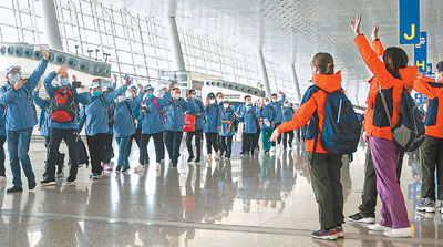 3月17日,在武漢天河機場,山東國家緊急醫(yī)學救援隊隊員(左側(cè))向江蘇國家緊急醫(yī)學救援隊隊員揮手致意。新華社記者 熊琦攝