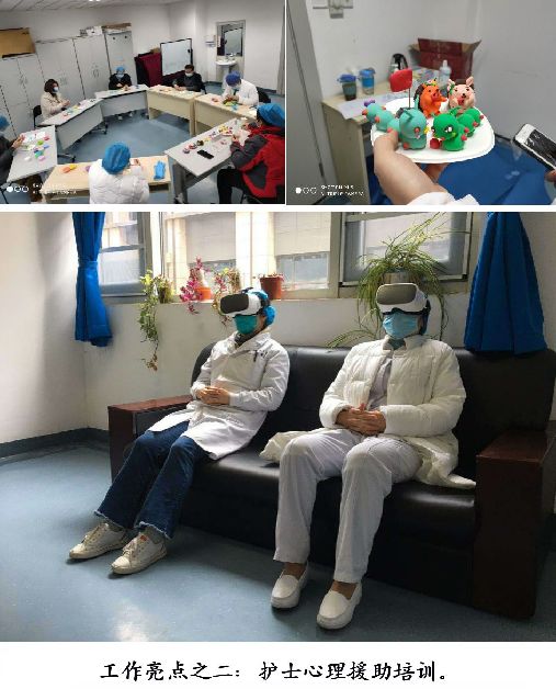 武漢大學(xué)人民醫(yī)院東院根據(jù)專(zhuān)家組提供的方案,制定了本單位具體實(shí)施方案,在醫(yī)院?jiǎn)T工休息區(qū)開(kāi)設(shè)醫(yī)務(wù)人員心靈驛站,營(yíng)造溫馨輕松環(huán)境(房間布置、花、食物等),播放有關(guān)心理健康知識(shí)、放松訓(xùn)練、心理干預(yù)技巧音頻視頻,為來(lái)訪人員提供生物反饋、音樂(lè)治療、放松訓(xùn)練、智能心理減壓放松系統(tǒng)(虛擬現(xiàn)實(shí))、手工制作等心理健康服務(wù)。心靈驛站為醫(yī)護(hù)工作者在繁忙的臨床工作后,提供了一個(gè)休養(yǎng)生息、溝通交流、鼓勁加油的場(chǎng)所,有效緩解了醫(yī)護(hù)人員緊張、焦慮等情緒。