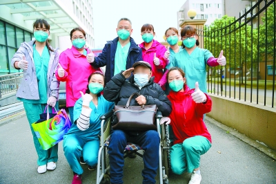 昨天上午,武漢協(xié)和醫(yī)院西院北京醫(yī)療隊(duì)負(fù)責(zé)的病區(qū)內(nèi),一名91歲的老兵孫爺爺康復(fù)出院,與平日里照料自己的醫(yī)護(hù)人員合影時,老兵敬了一個軍禮。記者 和冠欣攝