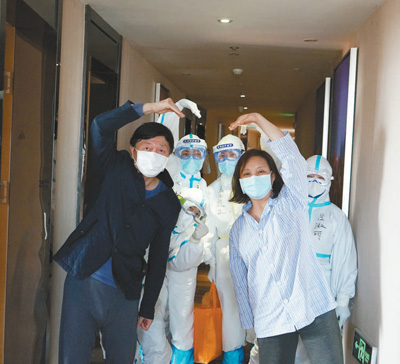 在麗楓康復(fù)驛站隔離區(qū),即將出站的康復(fù)者與醫(yī)護(hù)人員合影。本報記者 申少鐵攝